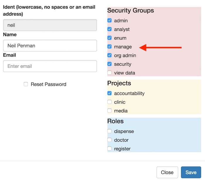 - Give yourself the security group of “manage”
