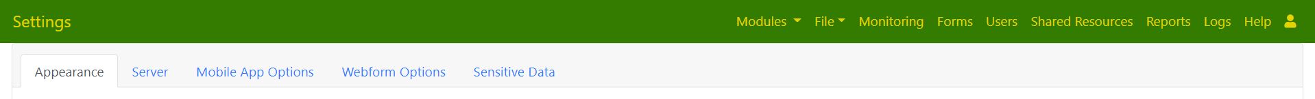 The settings page can be accessed from the Admin module. It has multiple tabs that allow you to configure various parts of the system.