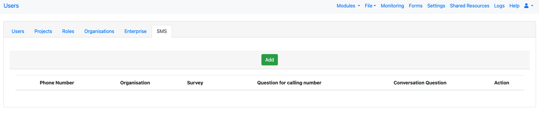 As the server owner navigate to the users page and select the SMS tab. You will see a button labelled "Add".