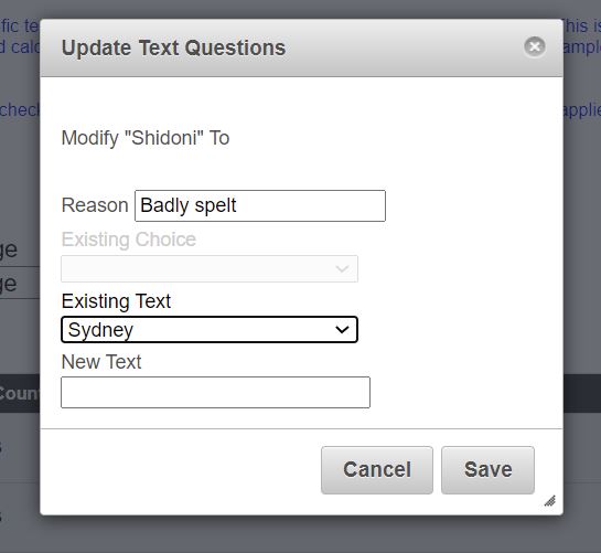 I have entered a reason for the change and then selected "Sydney" from the existing alternate answers to the question as the new value for the answer. After pressing "Save"all the wrongly spelt values are updated.