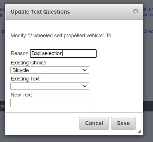 In the above example you can see that there were 8 surveys completed where the "other" choice was not selected and one where the response was "2 wheeled self propelled vehicle". We have a choice "bicycle" that should probably have been used instead. Select the update button next to that response and a dialog is shown.