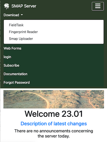 For SmapServer 23.01 and above, fieldTask is downloaded from the download menu on the server home page. Using the internet browser on your phone enter the URL of your Smap Server. If you are using the public server then that would be https://sg.smap.com.au. Then select the download menu and select FieldTask. The application will then be downloaded to your phone.