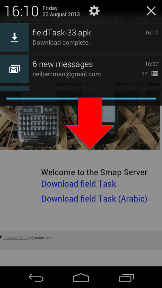 Drag down with your finger from the top of the screen in order to see how your download is progressing. Then tap on the fieldTask apk to install it or upgrade.