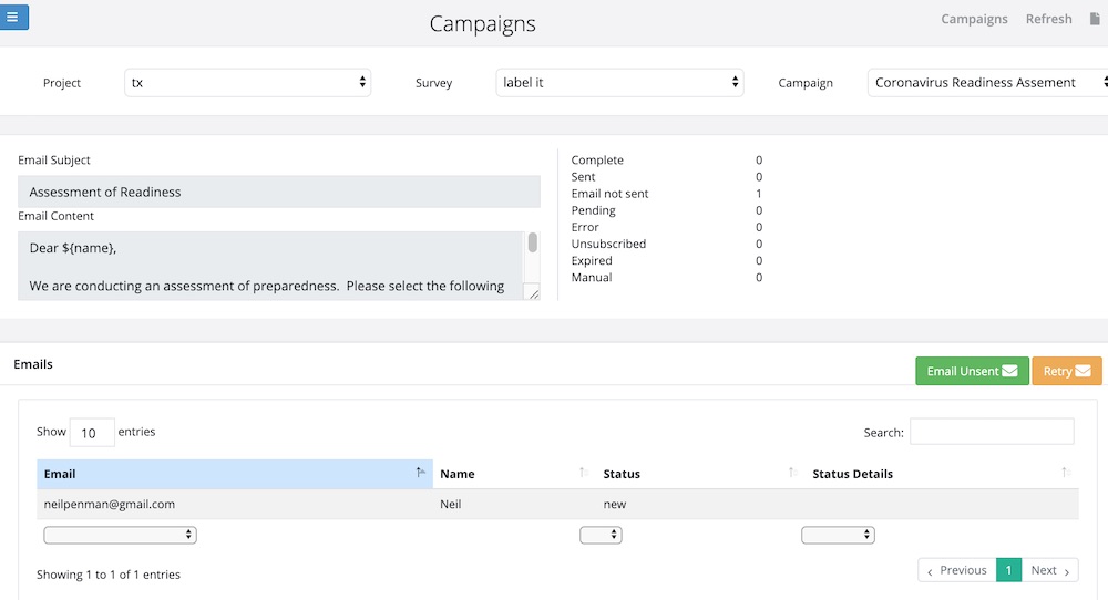 Alternatively if you have already sent emails and some of them failed, perhaps because the user was unsubscribed, then you can press the "Retry" button. This will send all unsent emails and will also try and send those with an unsubscribed or error status.