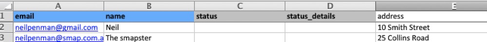 The columns status and status_details are ignored. They are only used when exporting the emails.