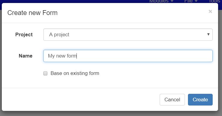 New surveys can be created from the survey management page, click on the Create new Form button. Alternatively go straight to the survey editing module by selecting Modules then Edit. Then select the menu File then New.