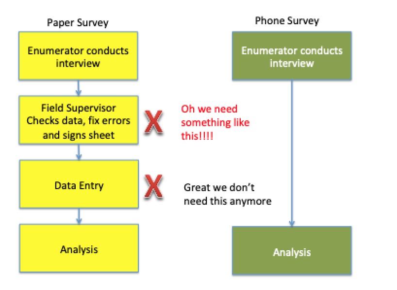 Mobile data collection can provide much higher quality than paper surveys however as the process is different some of the techniques you may have used for paper surveys are less easily applied and have to be replaced with different quality measures.