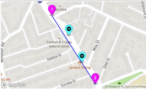 This question type has a specific purpose which is to represent cable segments and the location of faults along that segment. When a PDF is created for a survey that contains it, the geopoint values for the specified questions are combined onto a single map. The appearance contains the names of the geopoints. These are in order: