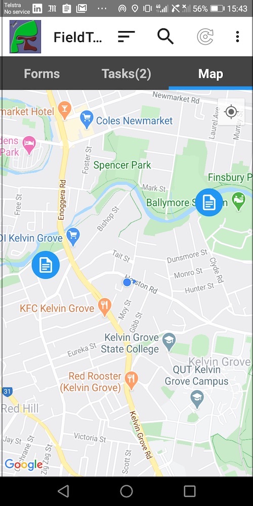 The tasks will appear as blue round icons. Do a short press on a task to see its address parameters. That will also cause a little menu to appear at bottom right allowing you to calculate a route using google maps. If you do a long press on the task in the map view it will open for completion.
