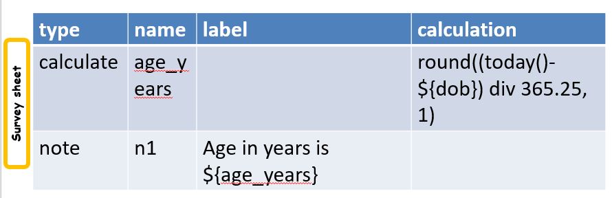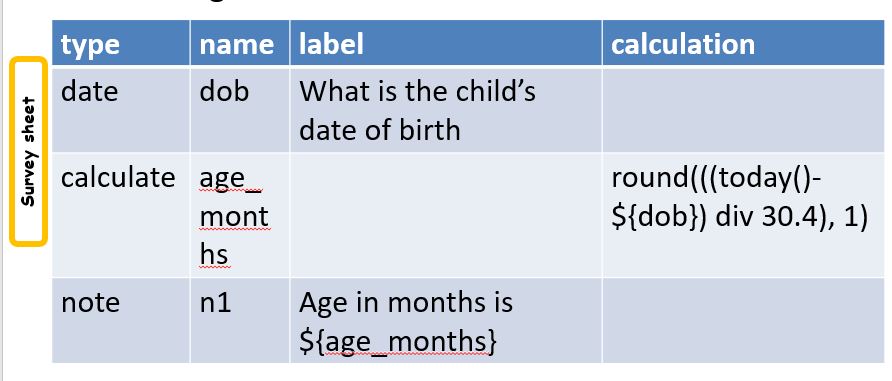 We put (today()-${dob}) in brackets because we want it calculated first. Then we divide by 30.4. This converts the number of days into roughly the number of months. Not calendar months but in many cases the more useful value of a number of months.