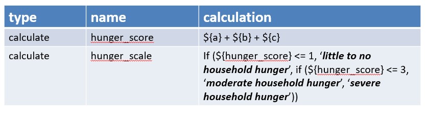 To make the calculation easier to read we can do it in 2 stages. First we calculate the total (hunger_score) and then we convert that into the hunger scale as shown below: