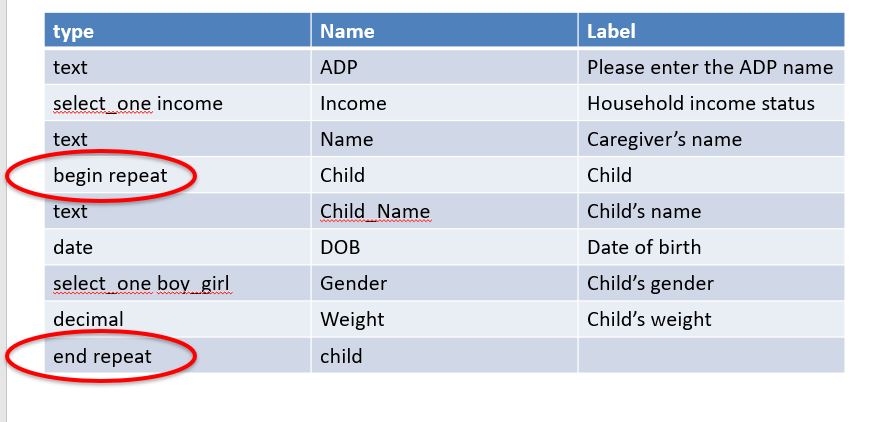 The label for the begin repeat is optional. If specified it will appear at the top of the screen in FieldTask while the user is in the repeating group.