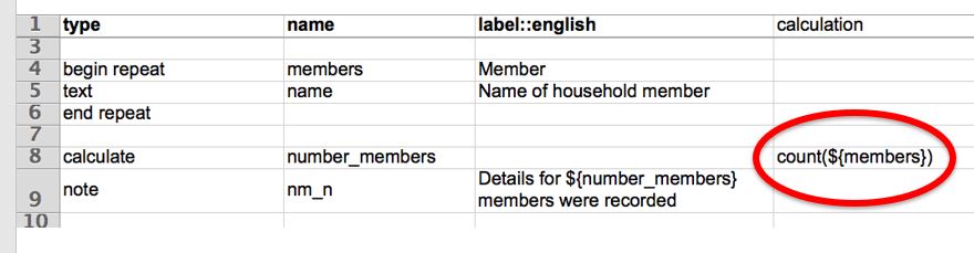 However you can configure the survey so that it repeats automatically a specified number of times without asking that question. For example you may already have asked how many people are in the household in a question called hh_members. Put a reference to that question in the repeat_count column in the row that has the begin repeat type: