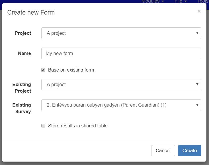 In the Create Survey Dialog select the checkbox Base on Existing Form